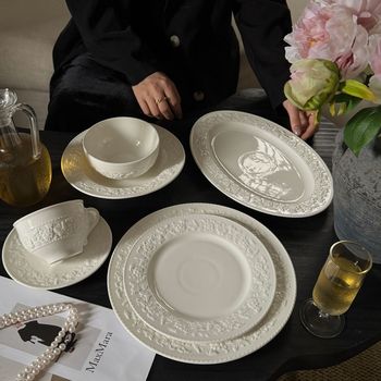 Juego de cuencos de plato de comida occidental blanco nuevo patrón de vid de cerámica plato de cuenco en relieve vajilla para el hogar